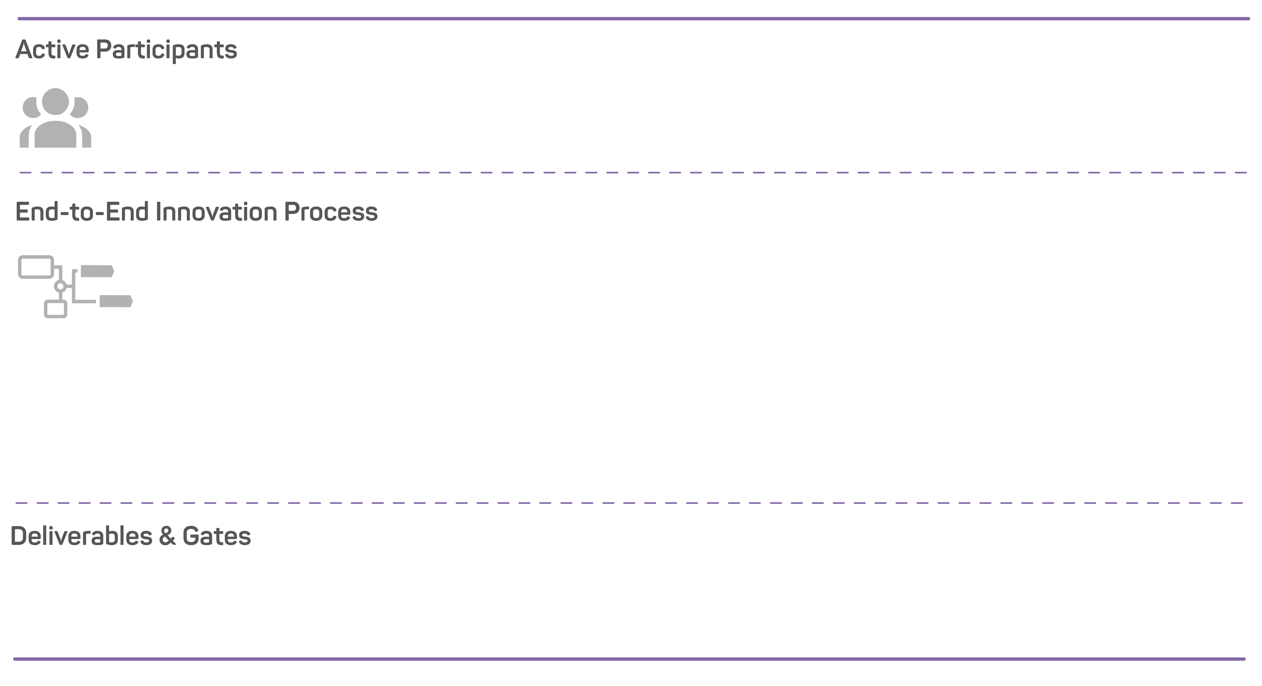 The End-2-End Innovation Process is always the core of the system and we usually define the crucial elements along the process. This quickly becomes an overwhelming task and we therefore slice overview into three levels: End-2-End Innovation Process, Active Participants and Gates & Deliverables. It makes sense to first sketch the stages of the innovation process (what needs to be done), then place the active participants and finally describe the deliverables per stage.