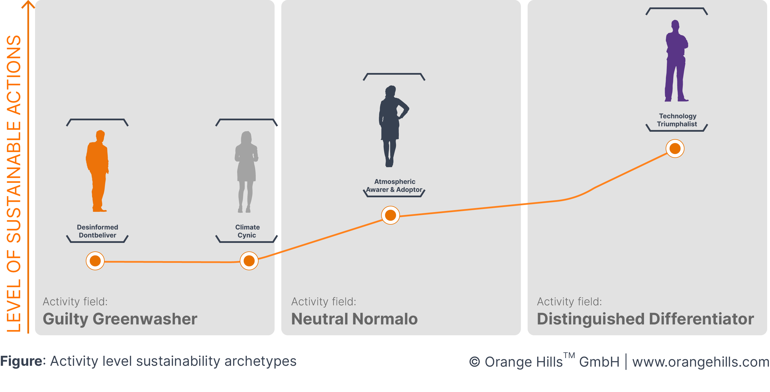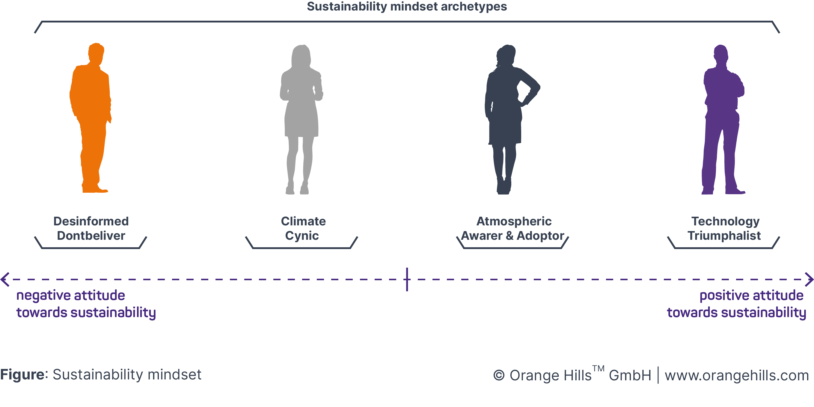 The sustainability mindset encompasses a range of archetypes, each representing a unique perspective and approach towards sustainability. Spanning a coordination system, these archetypes reflect both the level of action individuals take, ranging from doing nothing to actively engaging, and the attitude they adopt, ranging from negative skepticism to positive enthusiasm. By understanding these diverse mindsets, we can cultivate a more comprehensive understanding of sustainability. First we examine the attitude of the archetypes: